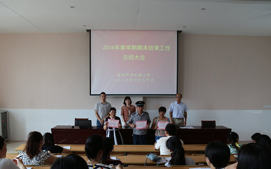 2016年6月30日下午,盐城市崇礼路小学教职工相聚学术报告厅,举行了春学期结束工作总结大会。会上我司陈金和同志被表彰为“后勤保障先进个人”。获此殊荣陈金和同志很开心,感谢学校领导对其工作的肯定,并表示以后将更加努力地工作,加强个人知识与技能的提高,严格要求自己,脚踏实地,尽心尽职,做好学校安全防范工作,为创建平安和谐校园贡献自己的力量。