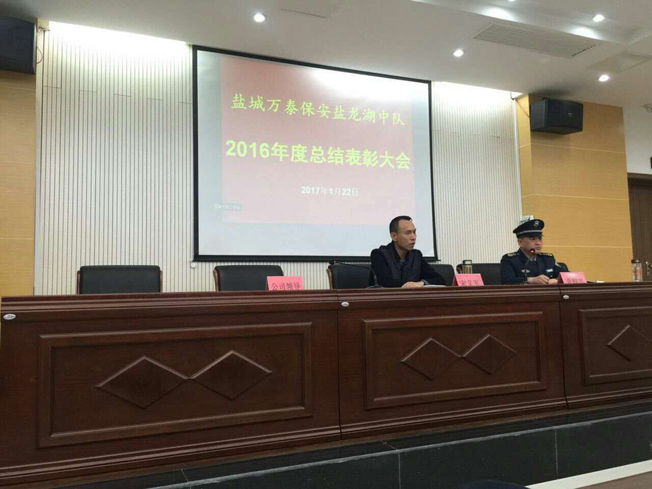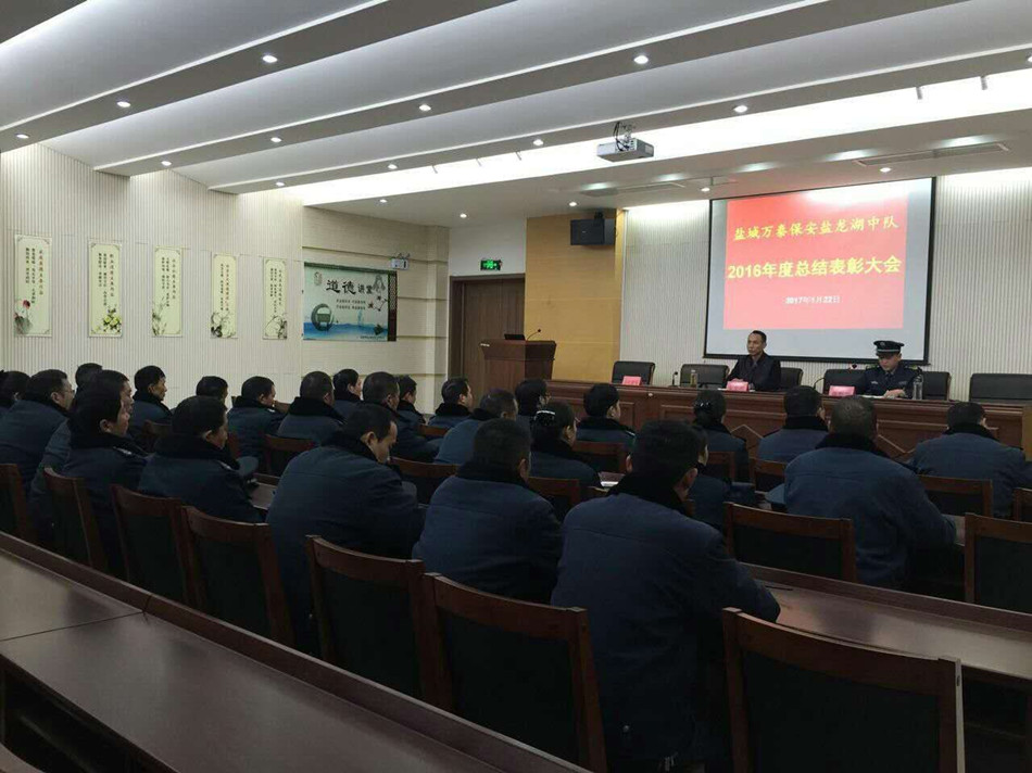 2017年1月23日,我公司驻盐城市盐龙湖水库保安中队召开2016年度工作总结表彰大会,对16年驻点保安工作进行总结,年度表现突出个人逐一进行表彰。同时对水库2017年工作做详细部署和要求。