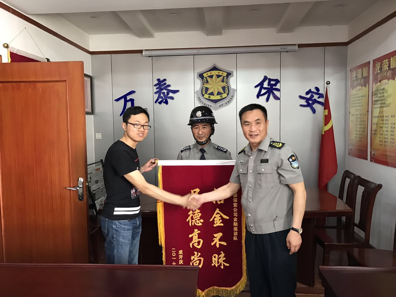 昨天下午,市民成先生将写有“品德高尚拾金不昧”的锦旗交到盐城万泰保安公司的保安员钟玉斌手中,感谢钟师傅在例行巡逻检查中捡到了自己新买的苹果7P手机,并及时送还。