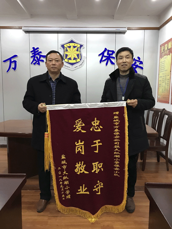 1月22日下午,盐城市大纵湖小学王竹林校长将一面刻有“忠于职守,爱岗敬业”的锦旗送到了盐城万泰保安服务有限公司,感谢万泰保安公司在校园安全保卫方面给予的大力支持和帮助,对保安人员文明热情,履职尽责,爱岗敬业,无私奉献的优质服务表示由衷的感谢。万泰保安公司书记宋云亮,保安部大队长蔡云生参加了赠送仪式,并与大纵湖小学领导座谈交流。
