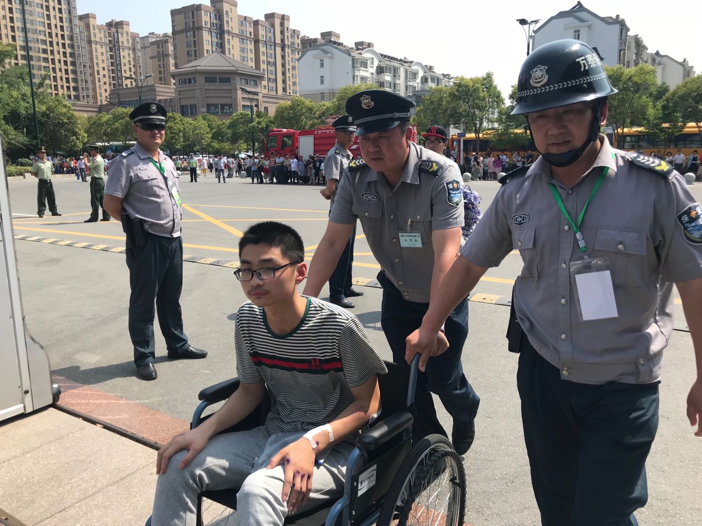 目击三:今天早上8点30分,神州路初中考点,有一坐着轮椅的男孩,在学校保安陈龙才、徐爱国的护送下,进入了考点现场,据了解得知,这位男孩名叫卡诚浩,是市一中高三(3)班学生,在6号下午来考点看现场的路上不慎摔倒,因身体多处受伤,腿部骨裂,行动不便,考场又在三楼,他在驻考点保安的全力帮助下送到了考场。