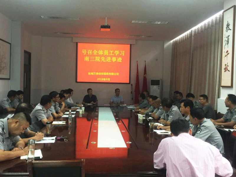 ●9月15日下午,保安部蔡云生大队长在队长会议上号召全体保安员学习南三院先进事迹,大力弘扬他们的优秀品质和积“小善”聚“大德”的无私奉献精神。