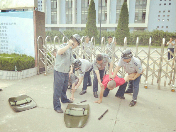 三、模拟不法分子强闯校园应急演练,不法分子强闯校园,保安人员奋力拦击,制服不法分子。