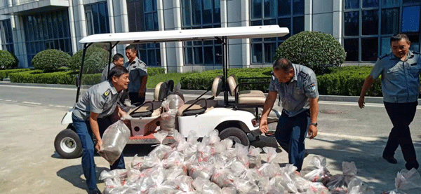 ●8月21日,驻电力中心保安员根据汛期防范要求,积极做好汛期防范工作、提前预警,提前采取措施,保安人员正在用泥沙装袋,近500只泥沙袋整装备用,以确保客户单位地下车库车辆、配电房等重要设备安全。