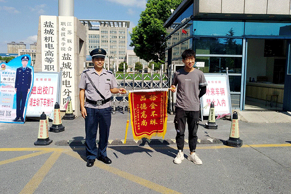 9月12日上午,盐城万泰保安服务有限公司驻机电高等职业技术学校保安袁保华同志,收到了施程俊同学送来的“品德高尚、拾金不昧”锦旗。