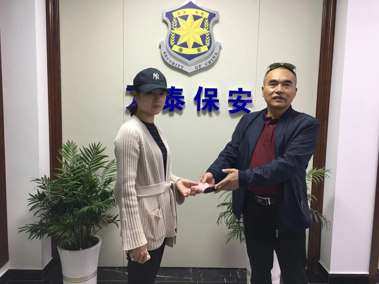 10月14日下午14:00左右,盐都实验学校保安员黄立斌同志像往常一样例行巡逻时,在校门口发现粉色钱包一只,他向四周望了望,却未发现形色异常人员。于是他捡起钱包,在原地等了十来分钟,但却没有人来认领。随后,黄立斌同志立即将此情况汇报学校保卫处和公司保安部,并按照公司规定将钱包带到保安室保管。后经过多方寻找,于当天晚上,黄立斌与失主取得了联系,接电话的是一位女士姓张,经过询问及物品比对,核实确认身份后,并约定第二天领取,黄立斌同志一大早就来到公司大门口等待失主的到来,将钱包内钱卡清点后,如数归还给她,失主接过失而复得的钱包,连声说道∶谢谢,谢谢,太感谢你们!