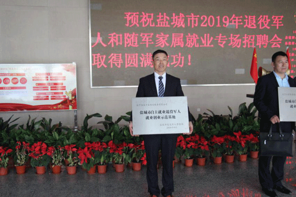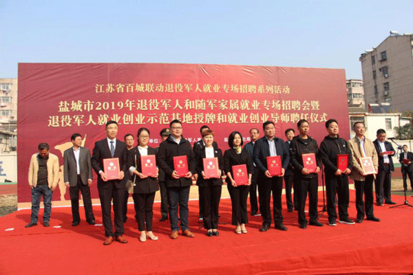 ●10月19日上午,盐城市退役军人事务局联合市人社局和盐城军分区政治工作处等部门,在盐城技师学院举办退役军人和随军家属就业专场招聘会暨退伍军人就业创业示范基地授牌和就业创业导师聘任仪式。在招聘会启动仪式上,盐城万泰保安服务有限公司等10家单位获得授牌,成为全市首批自主就业退役军人就业创业示范基地。