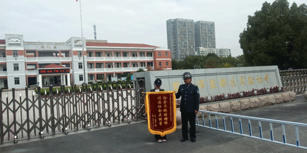 ●10月14日,盐都实验学校保安员黄立斌同志在校门口捡到钱包一只,后经过多方寻找,于当天晚上,黄立斌与失主取得了联系,经过询问及物品比对,核实确认身份后,并约定第二天领取,黄立斌同志一大早就来到公司大门口等待失主的到来,将钱包内钱卡清点后,如数归还给她,第二天一早,失主送来一枚“拾金不昧、品德高尚”锦旗。