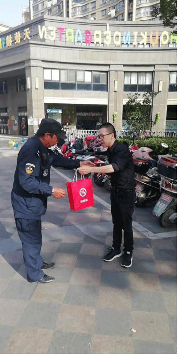 ●10月29日,黄海街道市容秩序管理员周同庆捡到一个红色包装袋,袋内装有对讲机一台,他立即将袋子与对讲机交给值班队长,并叫同事一起关注着,是否有失主前来打听消息,约一小时左右,一个姓王的失主来寻问,是否见到过一个红色包,经核对无误后,最终失物归还给失主。这是本月保安员第五次拾金不昧了,“拾金不昧”其实是反应一个人、一个企业道德水平的一面镜子。王红良、徐爱国、唐晓东、黄立斌、周同庆同志拾金不昧的行为,充分表现出了一名保安人员的高尚人格品质和良好社会公德,也是我们整个公司学习的榜样。