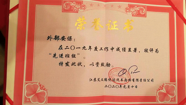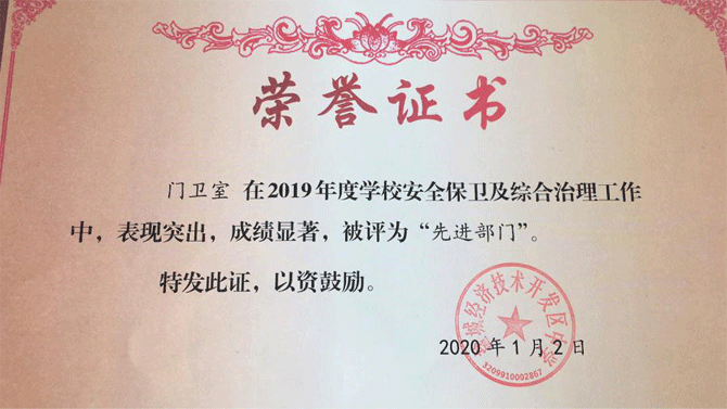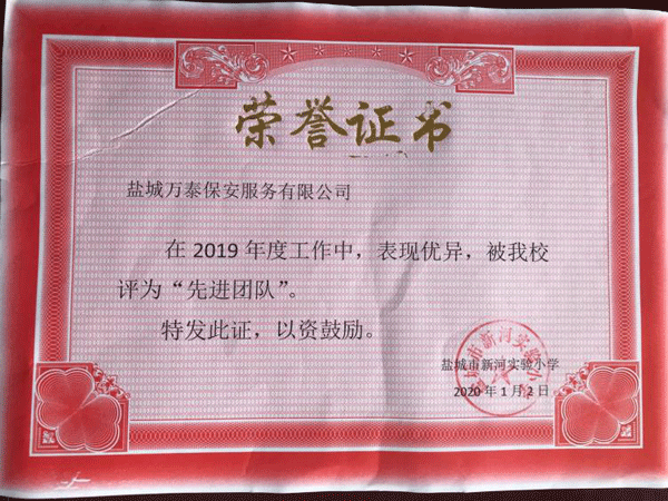 ●1月10日,我公司驻江苏艾文德悦达汽车内饰有限责任公司、经济技术开发区中学、新河实验小学保安中队收到驻点单位的表彰并获得荣誉证书。