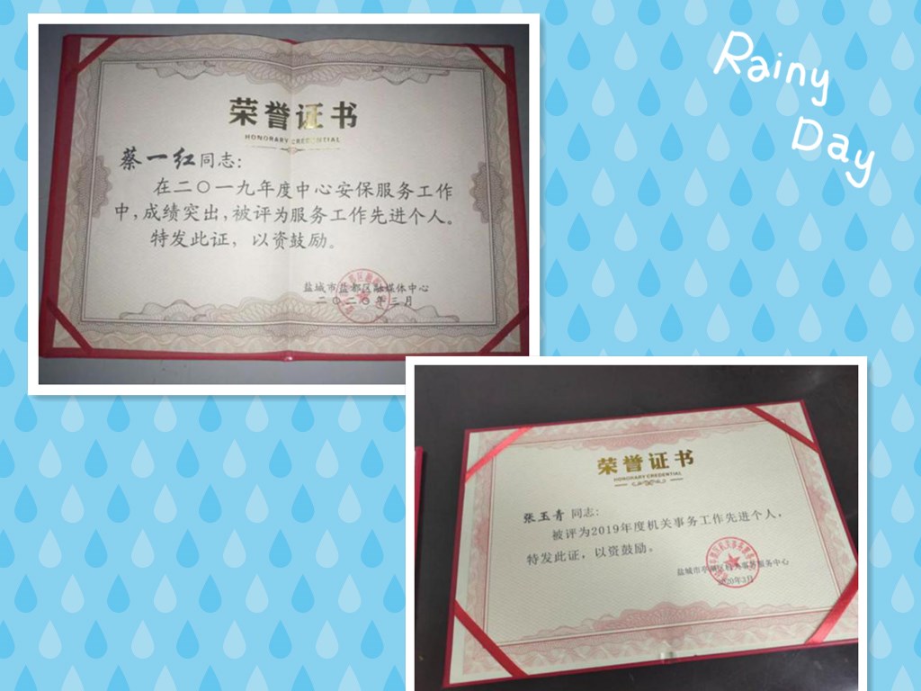 ●3月13日,我公司驻盐都融媒体中心保安员蔡一红、亭湖区政府保安员张玉青被客户单位评为“工作先进个人”。