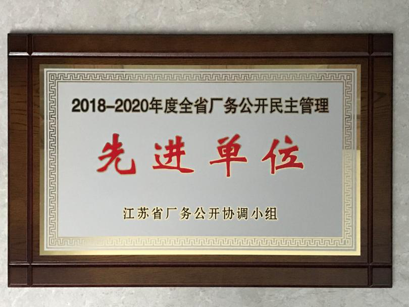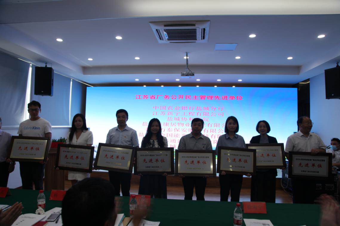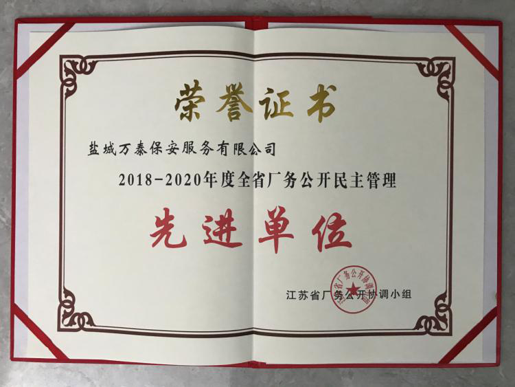 2020年9月4日上午,在全市“护航安全健康,携手共促发展”民主管理经验交流推进会上,盐城万泰保安服务有限公司作为保安行业代表,被江苏省厂务公开协调小组评选为“2018—2020年度全省厂务公开民主管理先进单位”。