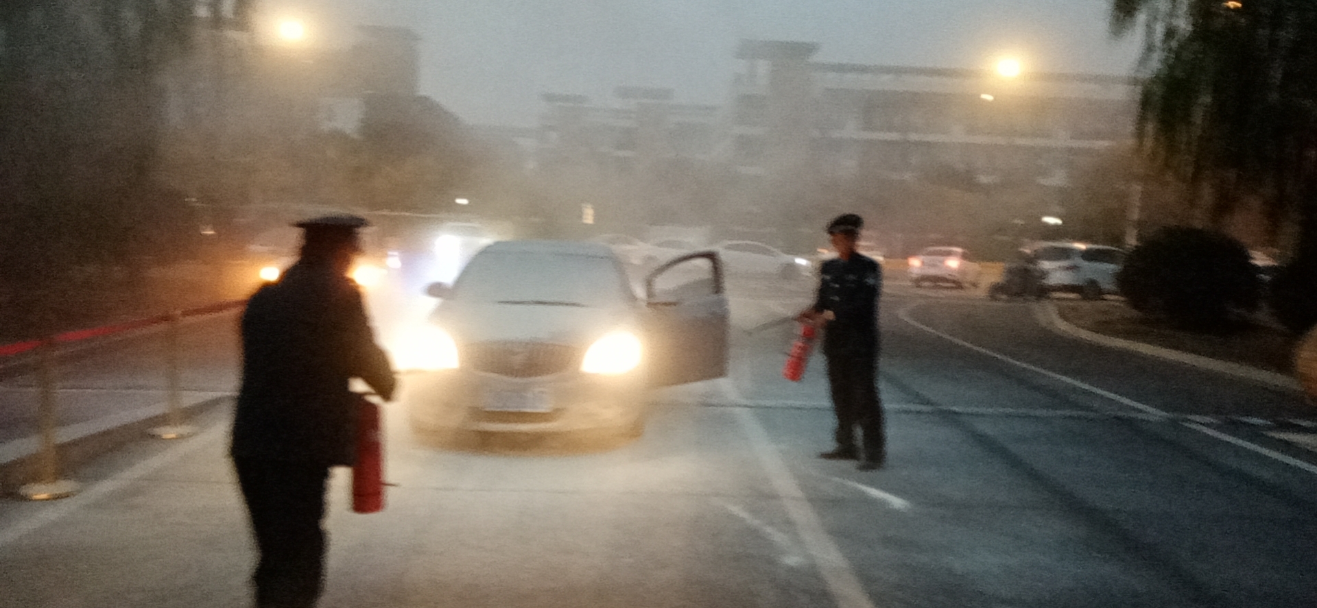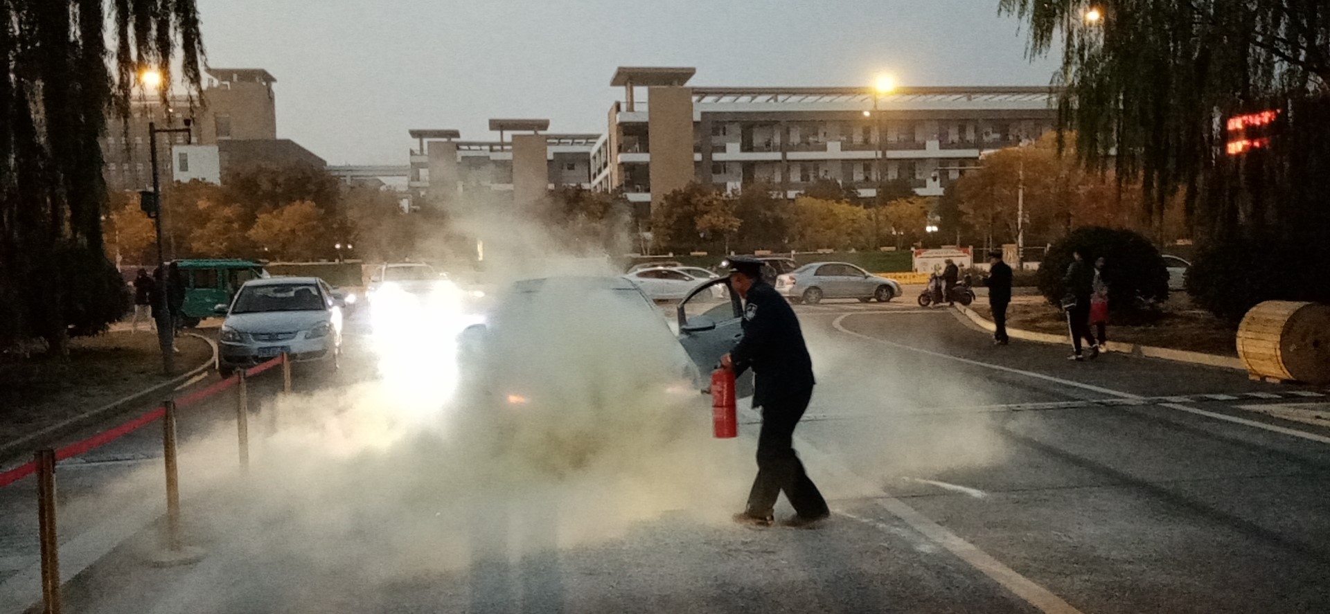 11月15日下午五点十二分,驻幼儿师范高等专科学校保安员正在学校执勤,例行对进入校园车辆做测温登记时,有一辆车牌为苏JD671D的黑色轿车开到校园门口时突发自燃,车内的女司机六神无主,弃车离开。在岗的保安员倪凤圣发现火情,他立即用对讲机通知王道明、李金玉等其他队员带灭火器赶到现场,迅速将情况报告保卫科,同时拨打119火警电话。紧接着,保安员带着灭火器赶到现场,经过二十多分钟的扑救,最终车辆的火苗被完全扑灭。