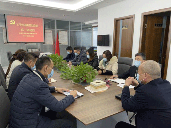 ●1月20日,公司党支部开展基层党组织统一活动日学习,会上,支部书记带领大家深入学习贯彻习近平总书记关于安全生产重要论述、重要指示批示精神;组织学习习近平总书记视察江苏重要讲话指示精神;组织学习党的十九届五中全会、省委十三届九次全会和市委七届十一次全会精神;组织学习《中国共产党党员权利保障条例》;组织收看全市“铁军号角”微党课大赛决赛视频回放及党建电视专栏《领航新时代》;贯彻落实“外防输入、内防反弹”常态化做好疫情防控,立足“严、细、实”管控措施,全力做好疫情防控工作;精心安排春节前生活困难职工走访慰问送温暖活动;号召党员带头参与全国文明城市创建,开展创文知识宣传、爱国卫生运动、“文明健康、有你有我”等活动;拟定2021年党员发展培训计划。