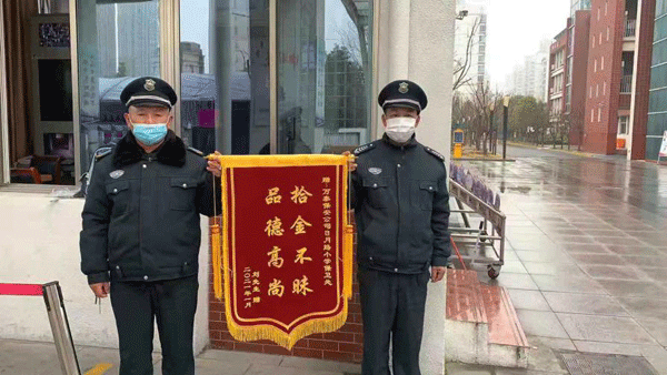 ●1月15日上午,日月路小学保安员杨兵日常巡逻时,捡到一只黑色手提包,看周边无人,他随即将手提包捡起带到保安室,并拨打报警电话,最终在110的帮助下联系到失主。1月22日,失主送来一面“拾金不昧 品德高尚”锦旗。