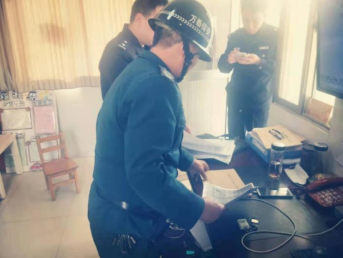(5月7日,伍佑派出所到伍佑幼儿园检查保安员证、装备器材、一键报警)