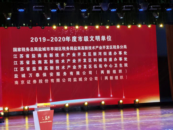 2022年1月11日,“党史学习见初心,好人好事话文明”2021年度盐南好人颁奖典礼在江苏省盐南高新区宣传信息和融媒体中心举办,我司荣获2019—2020年度全市“文明单位”称号。保安员柏寿朋、倪凤圣两名同志被评为2021年度见义勇为类“盐南好人”,受到表彰。