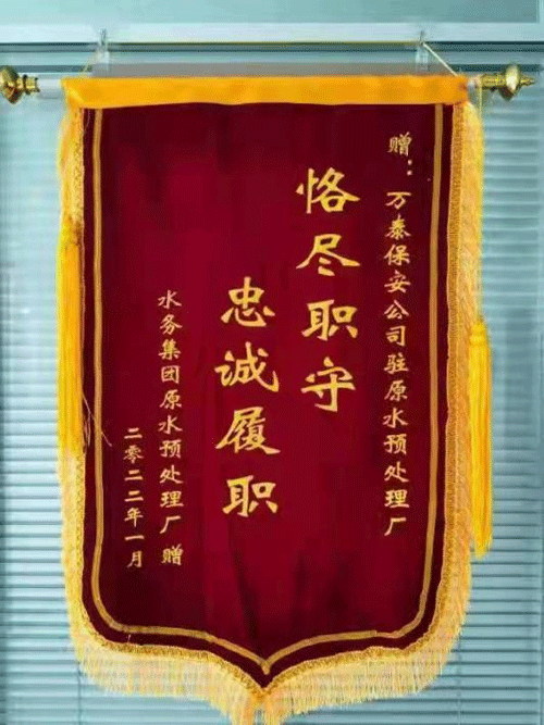 ●1月24日,公司驻通榆河原水预处理厂保安分队在朱永明队长的带领下,以确保全市人民的备用饮用水安全为己任,以高度的责任感、使命感坚守岗位,尽职履责,工作表现突出,受到了客户单位的肯定和好评,授予锦旗以示嘉奖。
