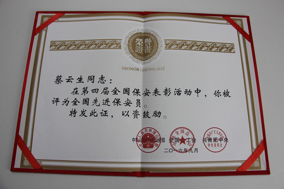 蔡云生获评全国先进保安员